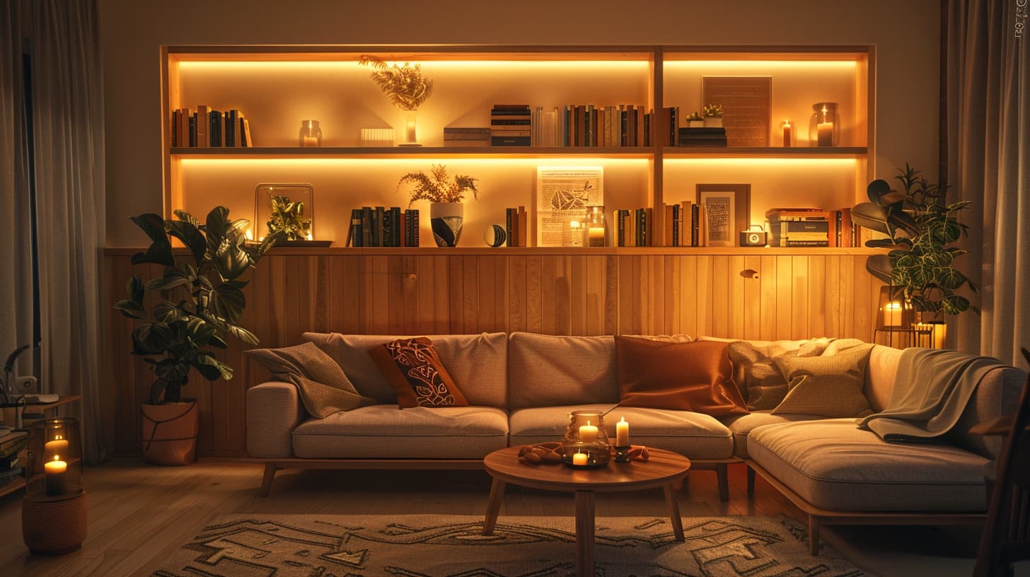 LED-nauhat sohvan takana tai television ympärillä luovat lämpimää tunnelmaa. Valitse lämmin valkoinen (2700K-3000K) kylmän valkoisen sijaan.
